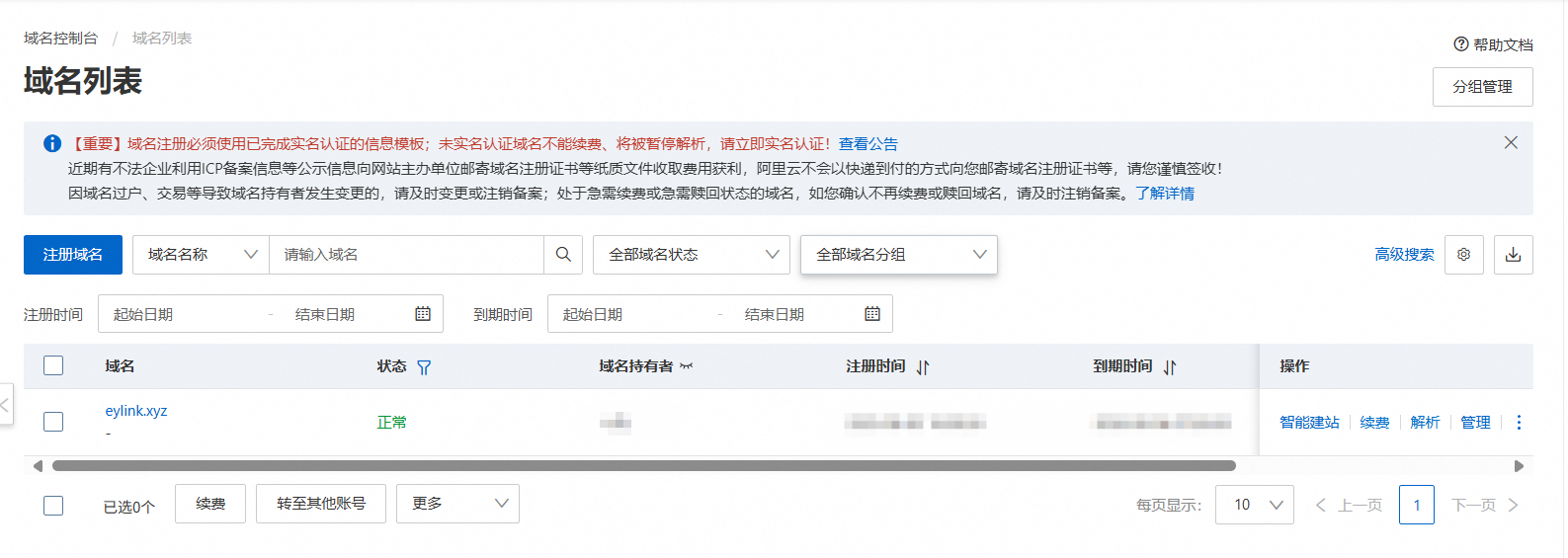 购买域名后进入域名控制台 域名列表 并点击解析