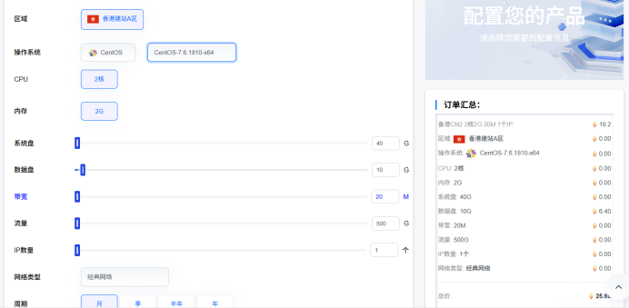3.购买服务器(左侧产品与服务-订购产品-选择分类中的云服务器-可选择任意产品(仅用个人博客月费用推荐20-30元 建议配置如图)